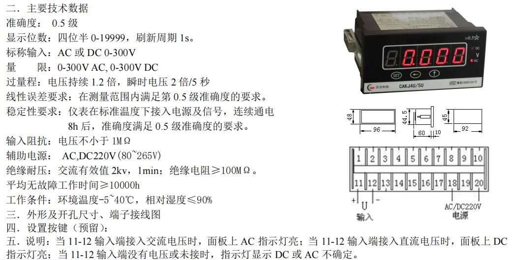 CAKJ494U/5U交直流電壓表適用于交直流系統電壓測量顯示。儀表采用高速AD轉換器及微處理器,對測量交直流電壓高速采樣,自動識別測量電壓為交流或直流,并帶有相應LED指示。