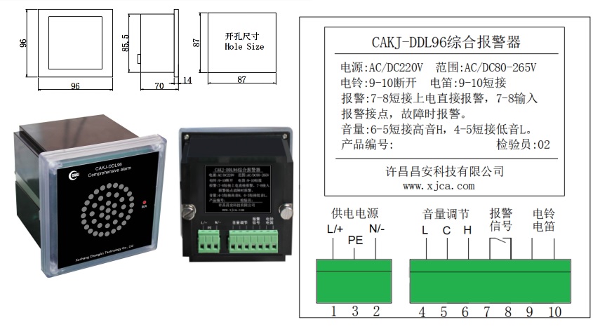 CAKJ-DDL96綜合報警器,是為電力系統中央信號報警而設計的一款低功耗、無干擾、大音量電子式報警設備。采用單片機模擬電磁式電鈴電笛聲音頻譜,其發聲與電磁式電鈴電笛發聲相似度達98%。