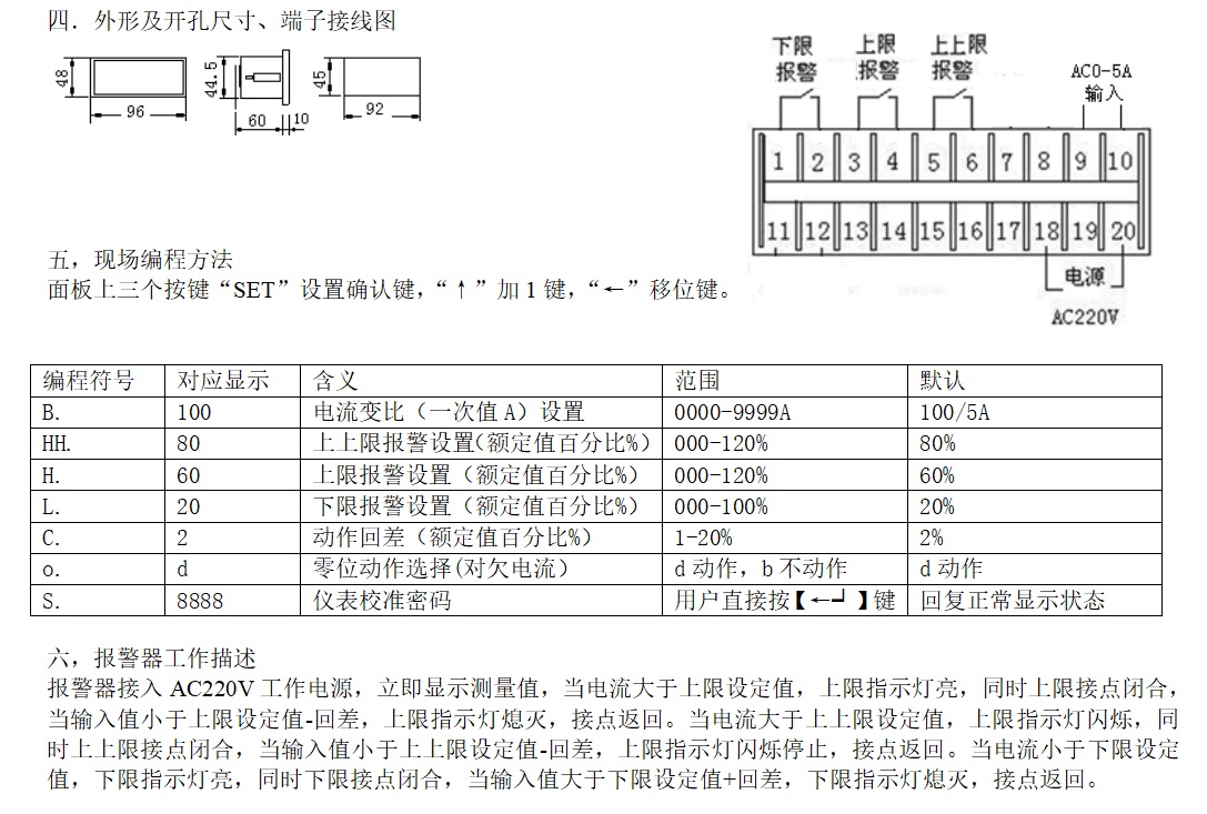參數:交流電流或電壓測量,上上限,上限,下限報警