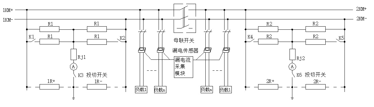通過母線橋式比較電路及乒乓輔助判斷電路,準(zhǔn)確計(jì)算出直流母線正負(fù)極對(duì)地絕緣電阻(單母線絕緣降低或雙母線平衡絕緣降低),支路霍爾傳感器漏電流監(jiān)測,并給出不同信號(hào),為直流系統(tǒng)故障分析提供依據(jù)。測量回路投入或退出可遙控投切(K3,K6)。