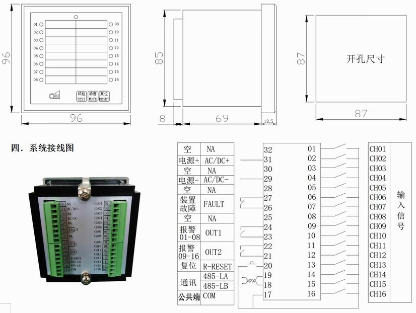 a.16個LED指示燈分別指示各路信號狀態(tài)(正常-滅,報警-閃光,消音-亮,正常后按復(fù)位鍵-滅)。