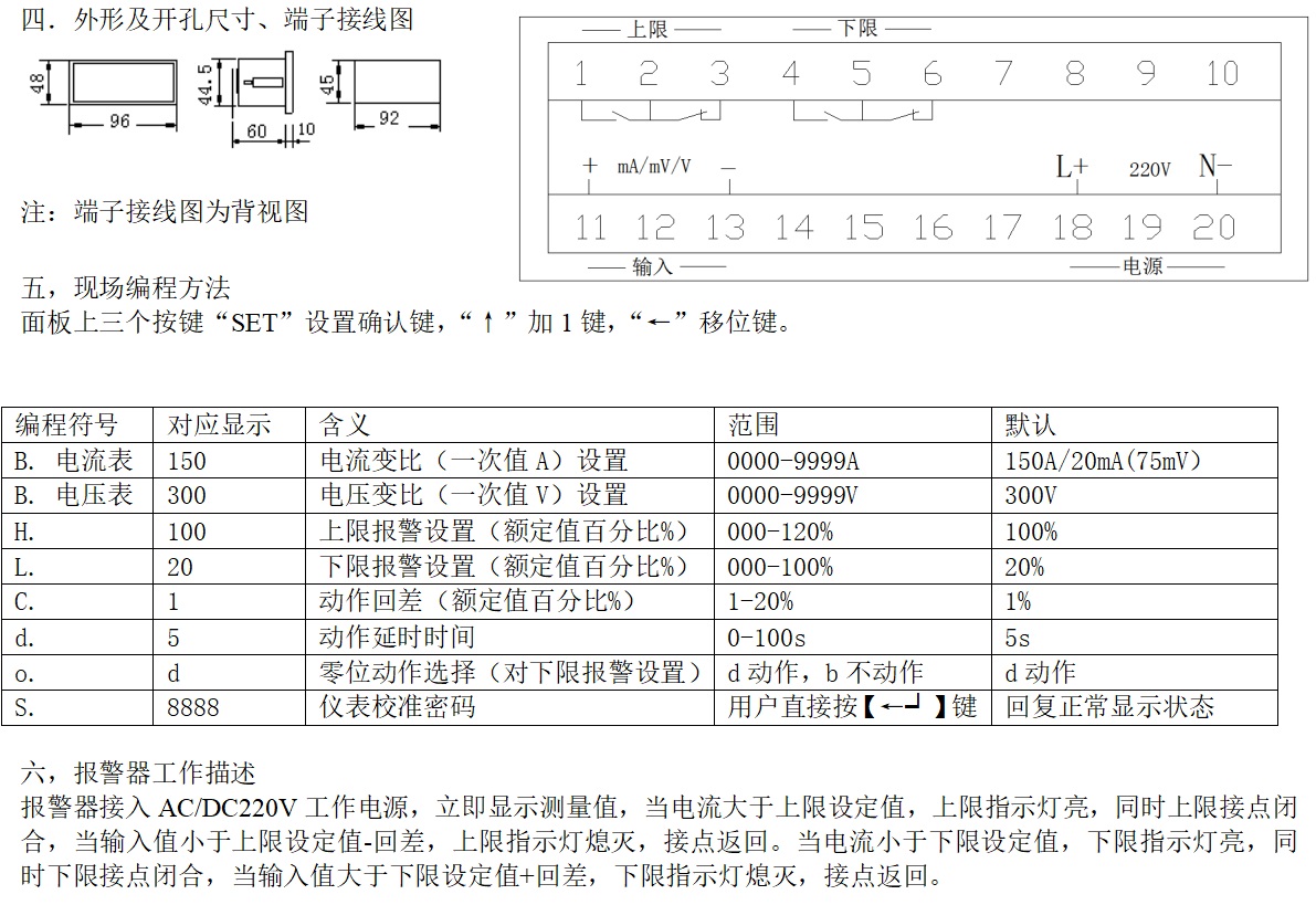 報警輸出:過流和低電流值可設置,兩路繼電器接點輸出