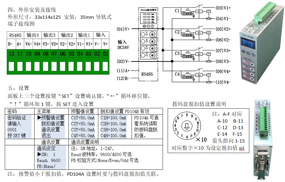 4,模塊通過面板上“SET”設置鍵、“←”循環移位鍵、“↑”循環加1鍵。在液晶屏上分別設置4路預警電流值,脫扣電流值(PD104B有效),當某路電流超過預警值,該路指示燈閃爍。當某路電流超過脫扣值(PD104B有效),該路指示燈滅,回路被自動斷開,重新接通該回路需手動按投入鍵。